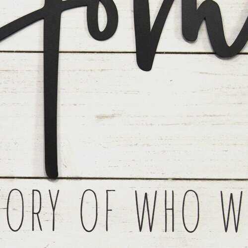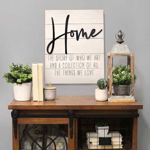 The "Home" Wall Decor has a warm and endearing message for family and friends. This simple yet powerful design features the word Home laser-cut in metal in a freestyle script along with "The story of who we are and a collection of all the things we love laser printed on a faux white wood-grain background. Its heartfelt aesthetic is sure to be appreciated and admired. Measures 15.75" W x 0.75" D x 20" H and is easy to hang using the attached D-ring on the back.